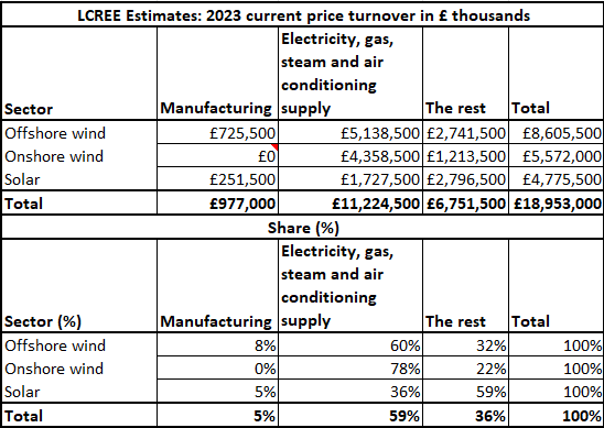 The LCREE is divided into various groups, such as low-carbon electricity and energy-efficient products, among others. These are subdivided into different industries, such as offshore wind or low-emissions vehicles. The turnover from these multiple industries is then split between various sectors of the economy (manufacturing, utilities, construction, etc).
