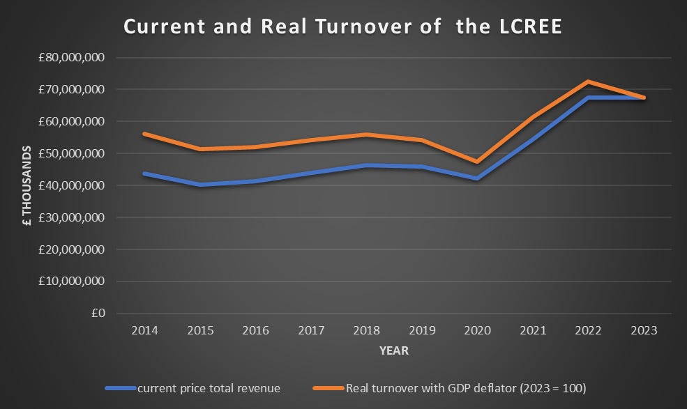 Figure 2: LCREE real turnover with GDP deflator (2023 = 100). Source: LCREE.