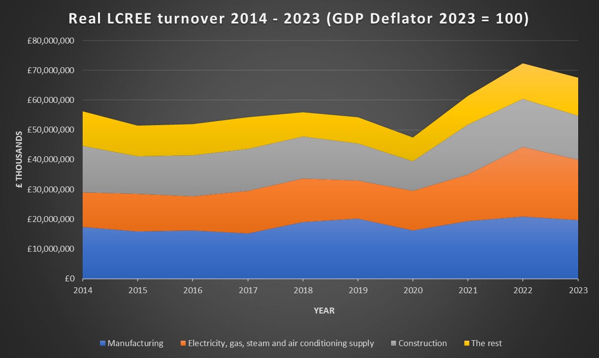 If I were Blue Labour, the Conservatives or Reform, I would use the LCREE to point out that the sacrifices we are making today are not going to translate into milk and honey later on. Overall, turnover for LCREE, excluding electricity generation, is barely keeping pace with inflation.