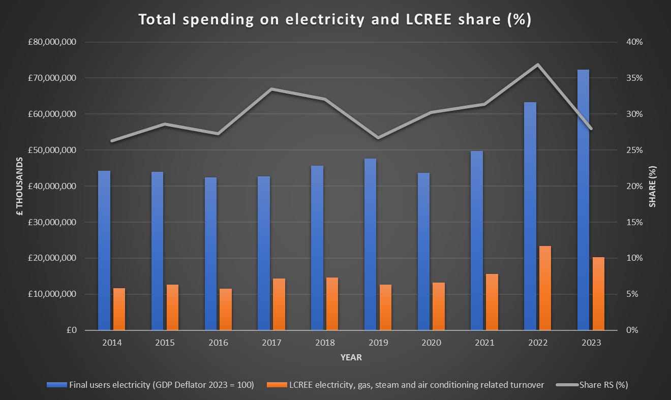 Figure 4: Final user electricity spending and LCREE electricity spending with GDP deflator (2023 - 100). Source: DUKES Table 1.1.6 Expenditure on energy by final user, £ million / LCREE 2023.