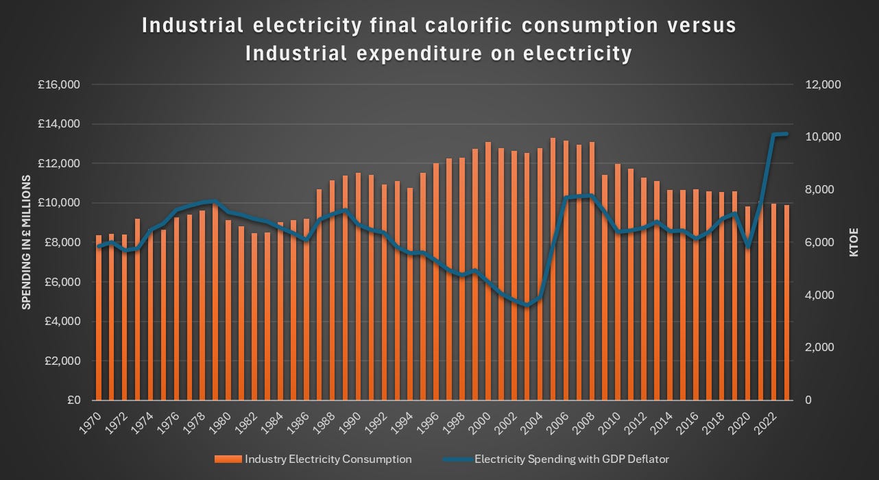 Figure 5: UK 1970-2023 industrial electricity consumption in thousands of oil equivalent (KTOE) and electricity spending (GDP deflator 2023 = 100). Sources: ECUK and DUKES.
